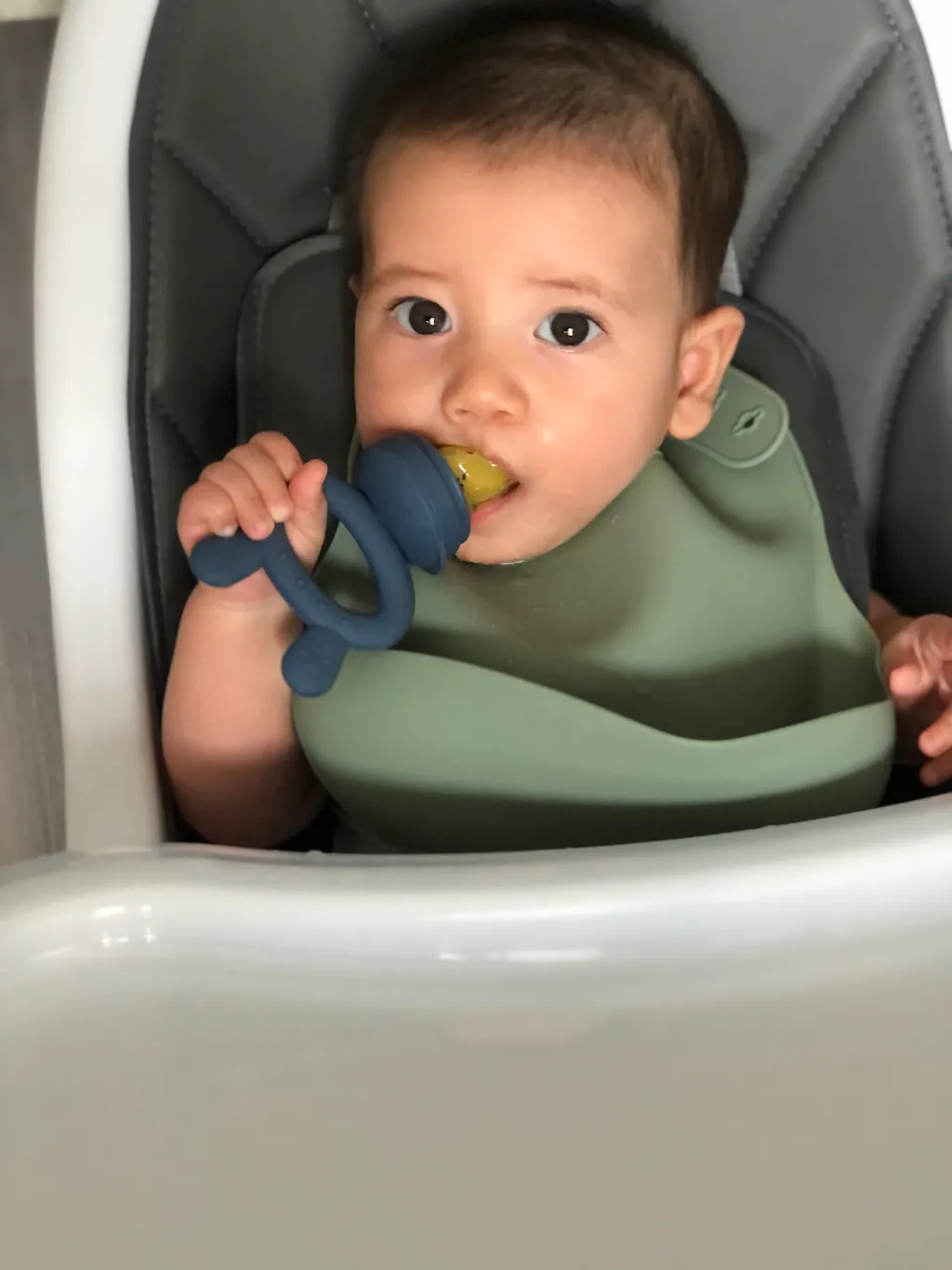 Our feeder is made from 100% food grade silicone and is more hygienic and durable than other mesh alternatives, which can harbour bacteria, absorb odours and tear. However, what really makes our feeder different from the rest is that it doubles as a teether! Simply turn the feeder upside down to let your child chew and suck on a 100% food grade silicone teether, keeping them entertained for even longer!