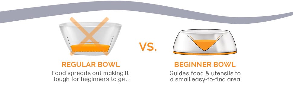 - Sloped interior walls to guide utensils to bowl bottom
